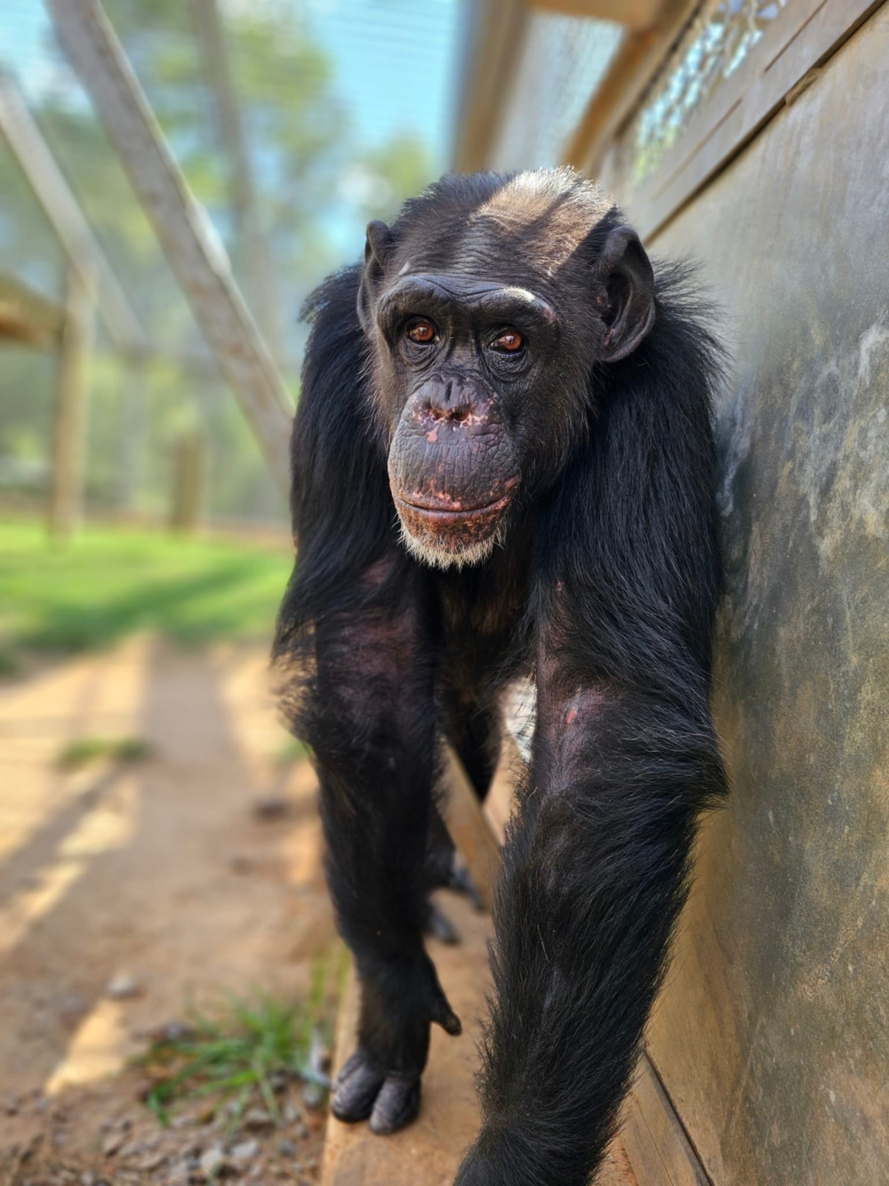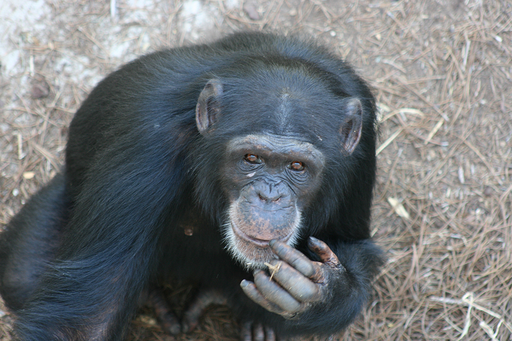 And as the seasons change, we always know summer is coming when we see Emma start collecting sticks. Emma’s group of eleven is comprised of highly intelligent chimps like her. When summer arrives, they know we will bring out big fans to place in the hallway areas of their indoor bedrooms to help keep them cool. Emma patiently waits for the fans to come out, ready with her sticks to try to get ahold of fan cords or anything left within reach that she could either use as a tool or a trade.