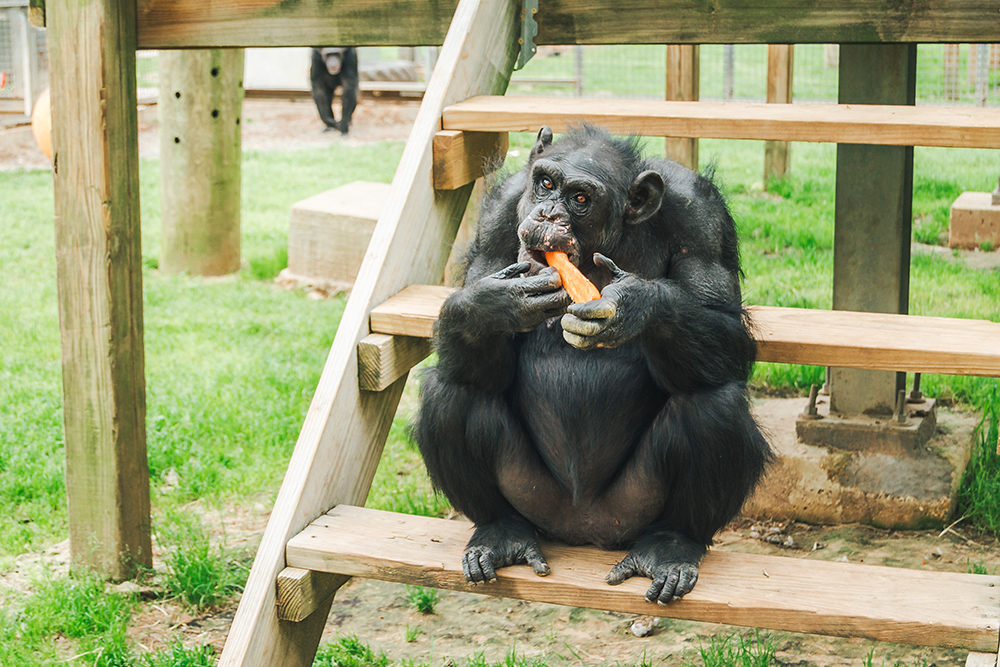 Every afternoon, all the chimps at the sanctuary enjoy a carrot as an afternoon snack. Most chimps aren’t very particular about the size or shape, but not just any carrot will do for Emma – she only accepts the biggest and juiciest. If you try to hand her one that does not meet her standards, she will shake her head and point to the biggest in the bucket. (Of course, we give her the one she wants.)