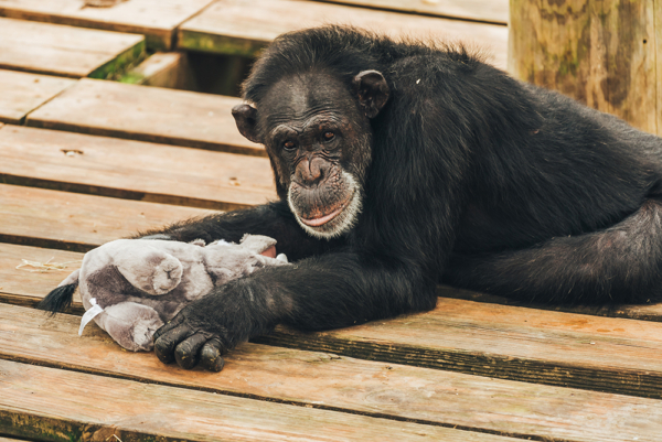 Fancy is a girl who lives up to her name in every way. She’s a staff favorite with personality to spare, perfect, spikey hair, a big, beautiful head, and a perfect, round belly. Fancy is close with her groupmate, PeeWee, who requires a lot of reassurance, which Fancy generously provides. In turn, PeeWee is the perfect bedtime cuddle buddy and likes to wrap his arms around Fancy’s waist as if they were posing for a prom photo. Fancy is a girl who knows her worth, and she insists on lots of belly rubs from her caregivers before she can be bothered to take the food or enrichment they’ve brought her. When it comes to belly scratches, this girl doesn’t take no for an answer, and she isn’t afraid to throw a tantrum when she’s not getting the attention she deserves. In addition to her dazzling personality, Fancy is quite the snappy dresser – when the chimps receive clothing items as enrichment, she loves to find a bikini top and show off her figure. If you’ve got it, flaunt it!