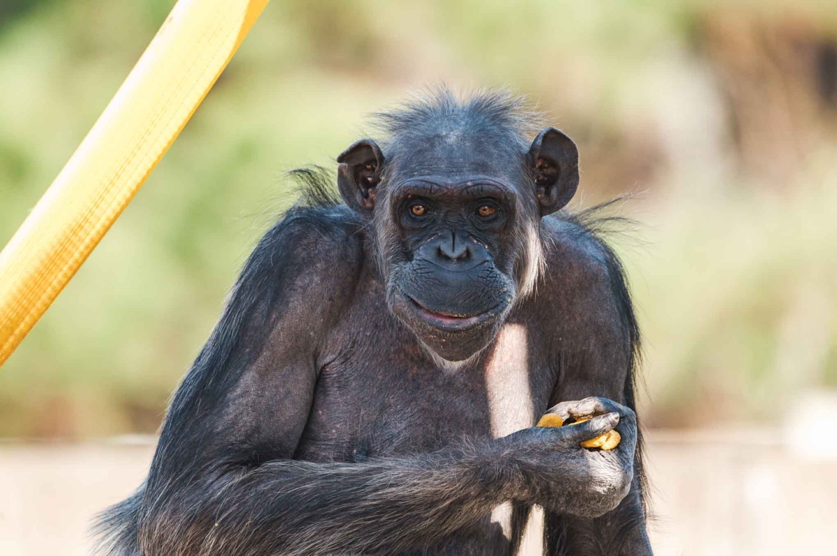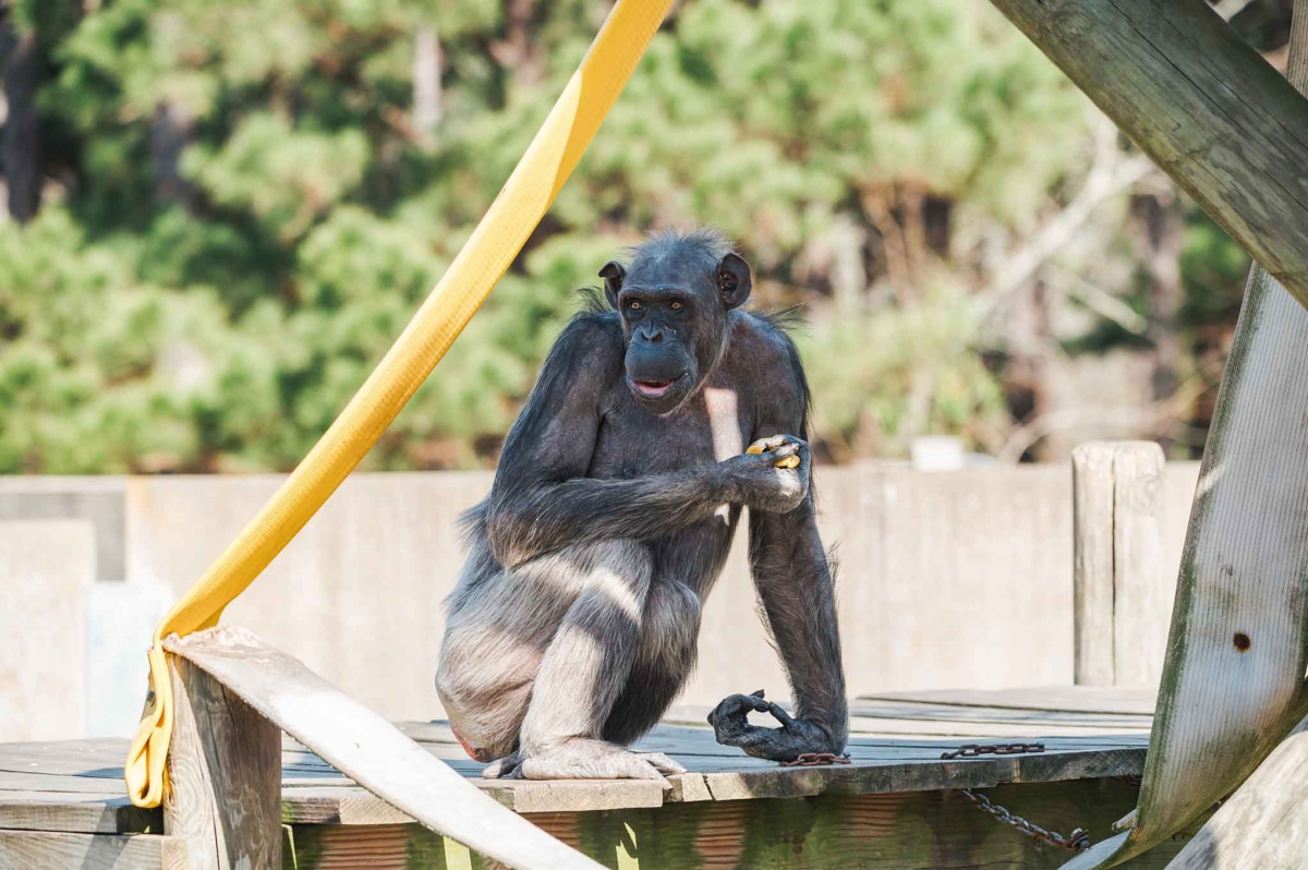 With warmer weather arriving, Flora is fully in her element — loving the sunshine, enjoying moat side happy hours with her group, and taking warm spring hikes around the habitat with her daughter and the other youngsters. Every afternoon her group makes their way down to the moat for their beloved happy hour, grooming each other, playing, and sipping water from the shore.