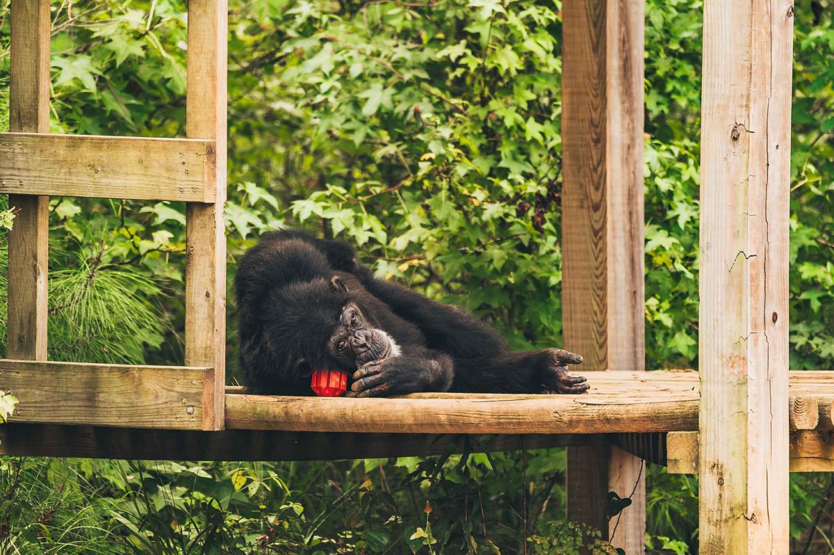 Independence hasn’t mellowed her personality one bit. Onyx is still the queen of attitude. She’ll “chimp arm” you if she’s not getting her way, and when one of her caregivers playfully showed her an empty banana bucket, she was NOT amused.